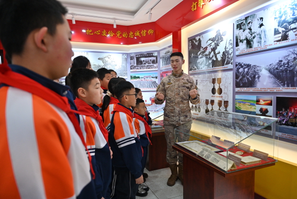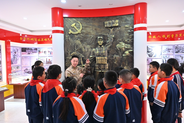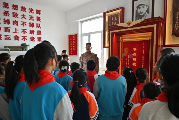 走进荣誉室,氛围肃穆而庄重。一面面锦旗、一件件旧物、一张张照片,无声诉说着光辉历史。战士声情并茂地讲述着英雄故事,从董存瑞舍身炸碉堡的壮举,到连队官兵传承红色基因、苦练打赢本领的事迹,孩子们听得入神,眼中满是对历史的敬畏、对英雄的崇敬。