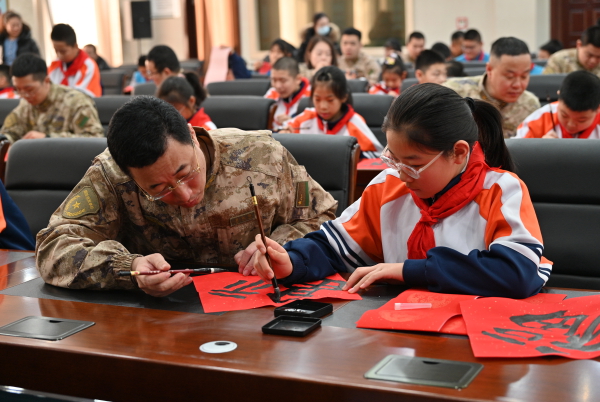 在军分区礼堂,红纸铺开,笔墨飘香。官兵们手把手教孩子们写春联、剪窗花,传承中华传统文化。“福”“春”“国泰民安”“阖家欢乐”……一个个饱含祝福的字符跃然纸上,虽稚嫩却真诚。窗花剪刀翻飞间,喜庆图案渐次成型,孩子们脸上洋溢着自豪的笑容。